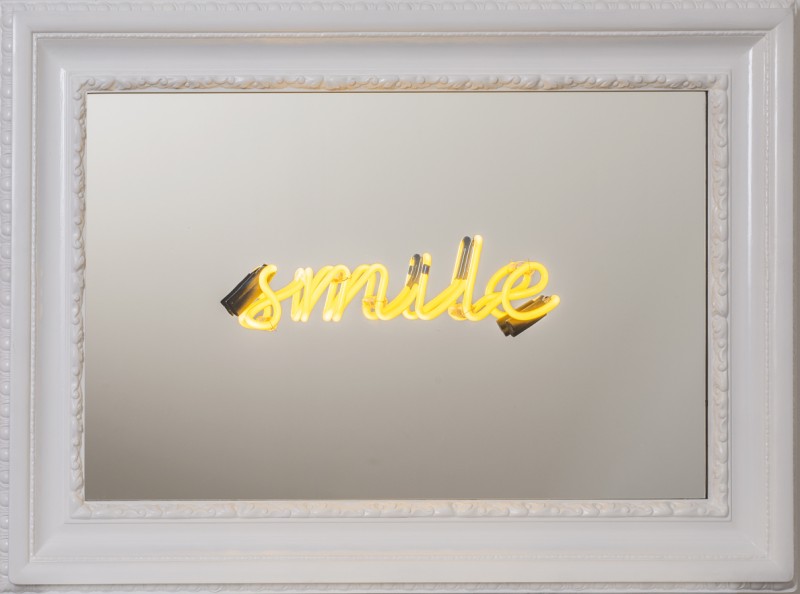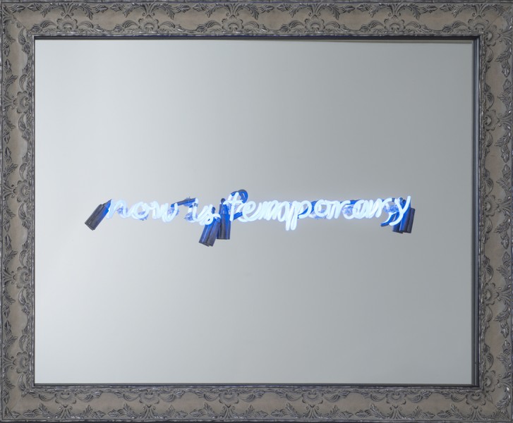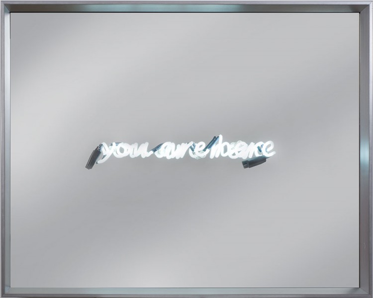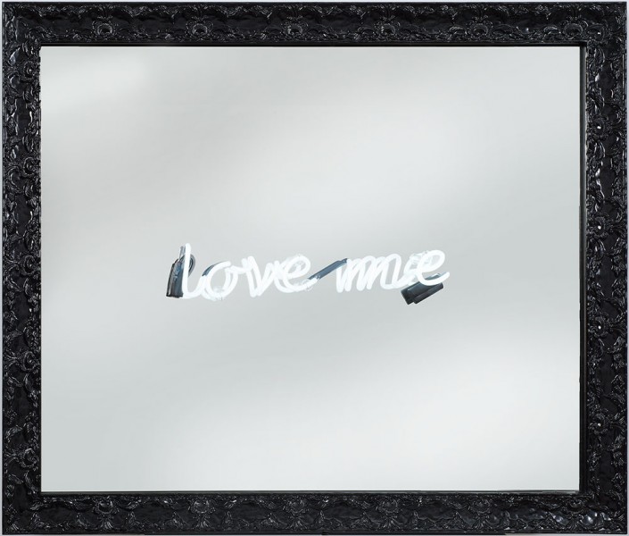 While I was passing Gallery Nine5 in Soho today, I noticed Tappe Francke’s newest mirror series on display. First let me say the photos do this series no justice. The experience is all about getting lost in these huge custom framed mirrors, the interaction of your reflection and the words scribbled in vibrant neon lights.