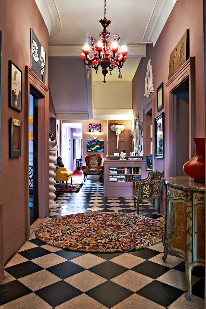 Designer Solange Azagury-Partridge is known internationally for her quirky take on fine jewelry. When you enter her shop you are immediately stepping into her world. Her design aesthetic with her home is no different. She masters the mix with Missoni carpet against checkerboard floor, morrocan tiles in layers of patterns, and bold colors and prints all coming together for this fantastic style that is Solange Azagury-Partridge.