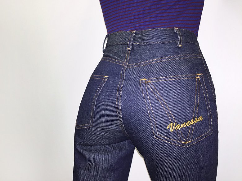 Vanessa Seward had models walk down her Paris runway with jeans personalized with gold embroidered names on their back pocket, and now you can have your own pair. Personalisation is all the rage and embroidered denim is huge. Jumping on the monogram train, Vanessa Seward has collaborated with APC and has a popup shop here in NYC. The jeans are japanese denim, and are a sophisticated take on 70’s high waisted jeans. Availabale on the Victoire and Alabama styles you can get them now with a complimentary gold embroidered name through December 8th at the APC store at 267 west 4th st. in NYC.