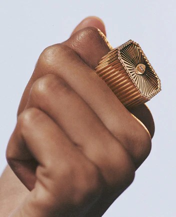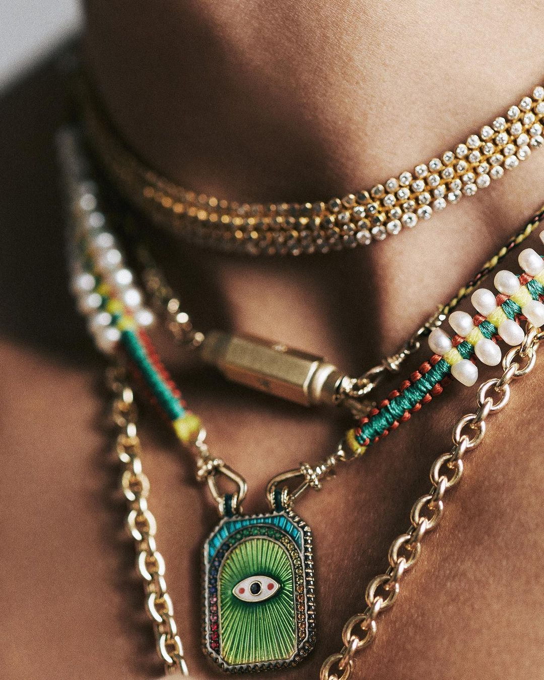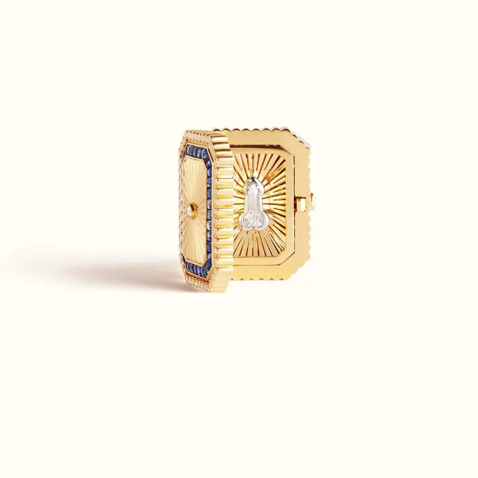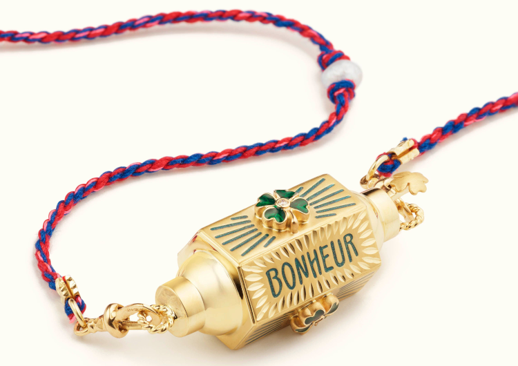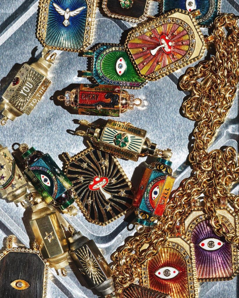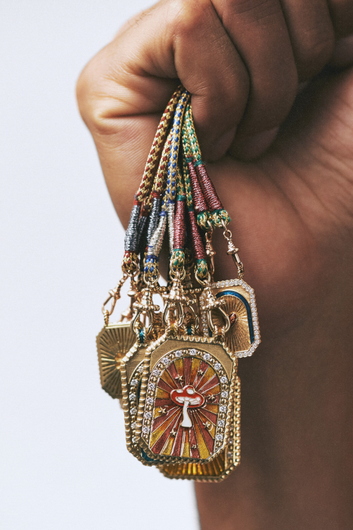 “I truly believe that there are words that have kind of magical powers,” Marie Lichtenberg says of her jewelry line that evokes just that, taking inspiration from her French west indie background and drawing from Indian culture, using colored threads from the kautuka ritual and meaningful prayers and phrases that do really carry a sense of magic in all of their originality. Lockets and pendants, featuring :Every little thing gonna be alright, Vivons heureux, Bonheur, Toujours, Protection, Luck, the surprise element of having lockets open up to hands in prayer, or the humor in the most outrageous “Dick in a Box”, the most beautiful diamond adorned surprise box ring that opens up to a diamond penis.