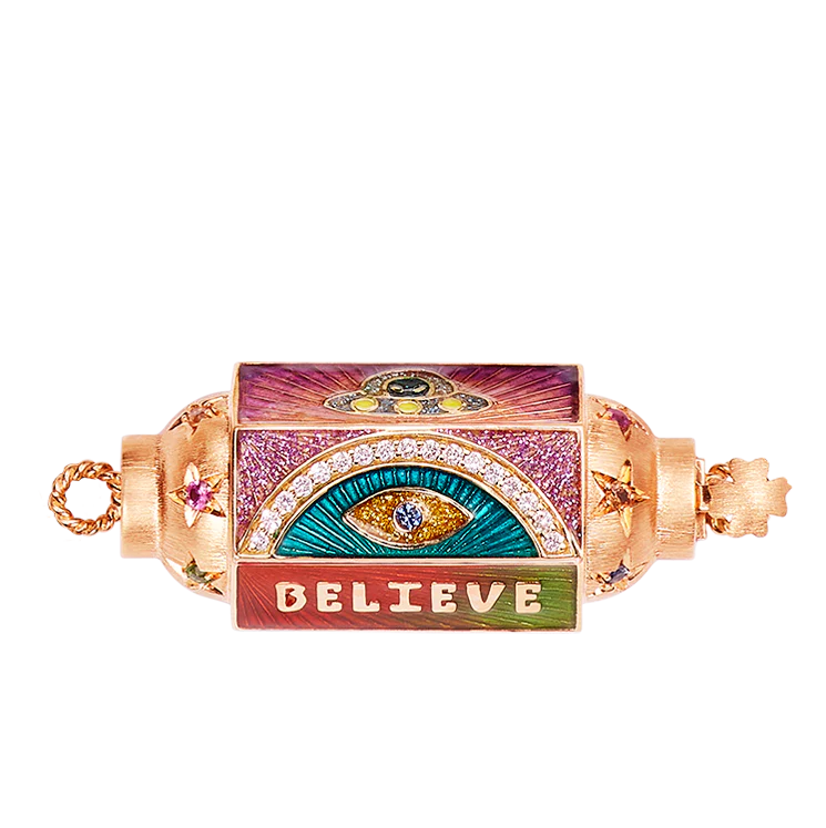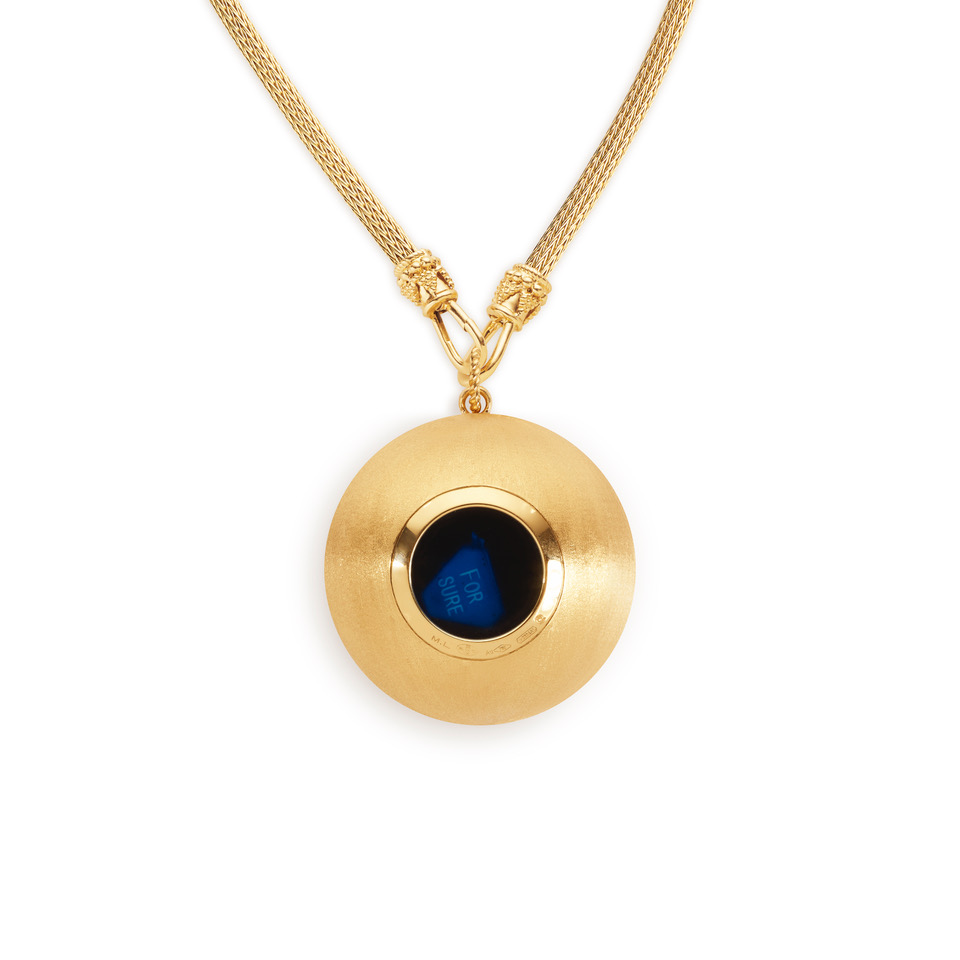 Magic 8 Ball Collaboration with Mattel, comes in hand enameled guilloche green, pink or red options, with rainbow sapphires or diamonds. This fortune telling toy is my favorite piece to date